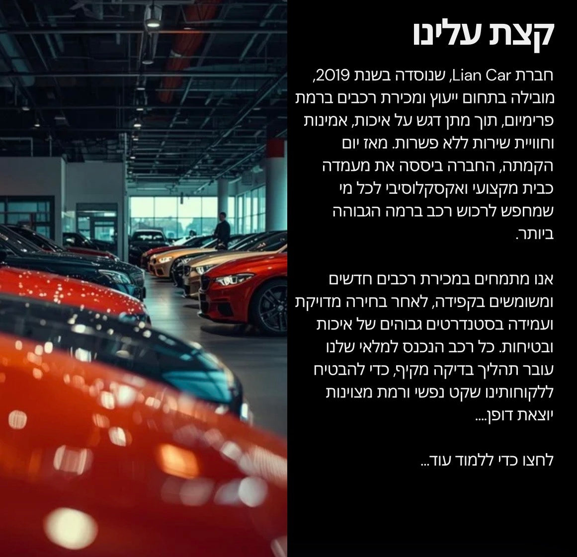 חברת Lian Car מובילה בתחום ייעוץ ומכירת רכבים ברמת פרימיום, תוך מתן דגש על איכות, אמינות וחוויית שירות ללא פשרות. מאז יום הקמתה, החברה ביססה את מעמדה כבית מקצועי ואקסקלוסיבי לכל מי שמחפש לרכוש רכב ברמה הגבוהה ביותר.